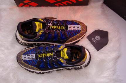 Step into high-fashion luxury with these bold Versace Chain Reaction sneakers that perfectly embody the brand's maximalist aesthetic. Featuring the iconic Greek key pattern in electric blue, striking yellow details, and "VERSACE" branding along the laces, these statement sneakers are designed for those who dare to stand out.
