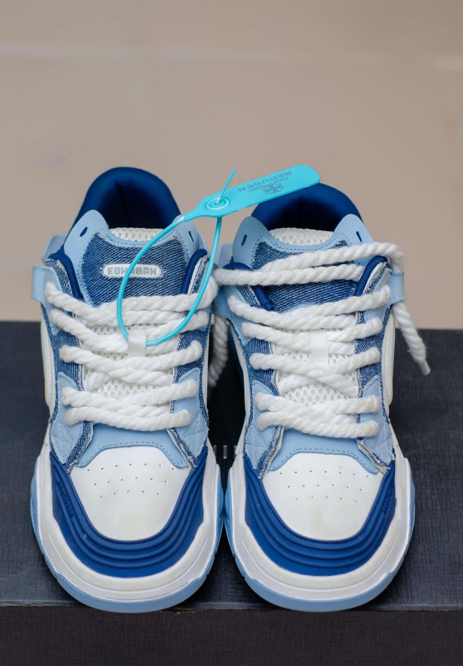 These trendy sneakers feature a bold combination of blue denim, white leather, and light blue accents. The chunky sole, unique design elements, and comfortable fit make them a must-have for fashion-forward individuals.