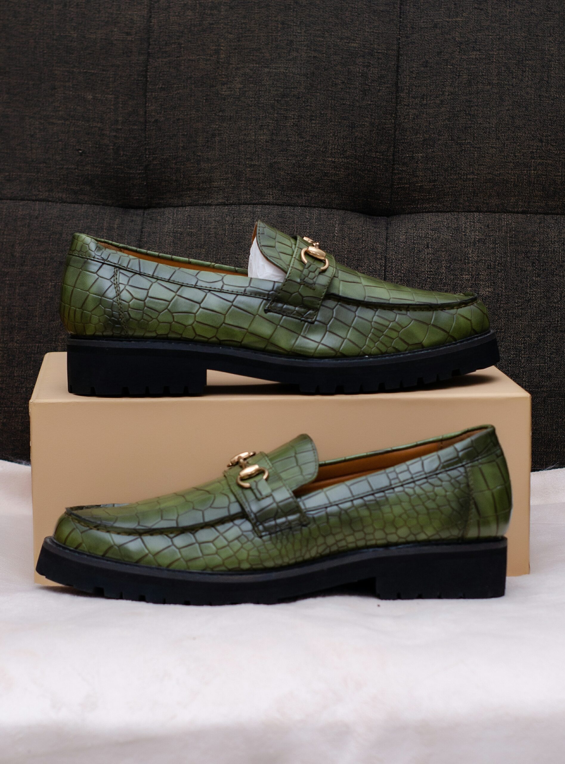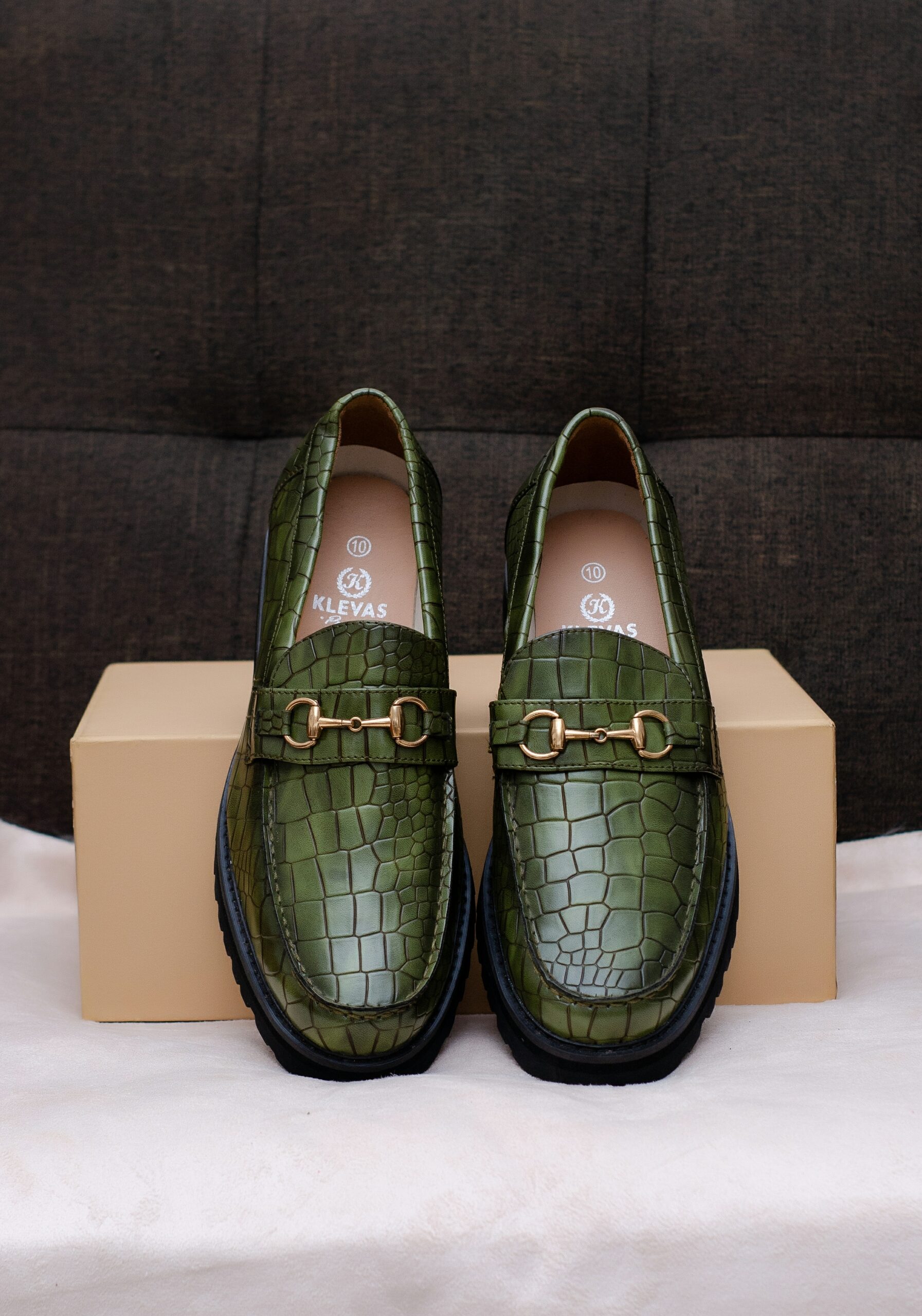 Elevate your wardrobe with the KLEVAS Crocodile-Embossed Green Loafers. Order yours today and experience the epitome of luxury footwear.