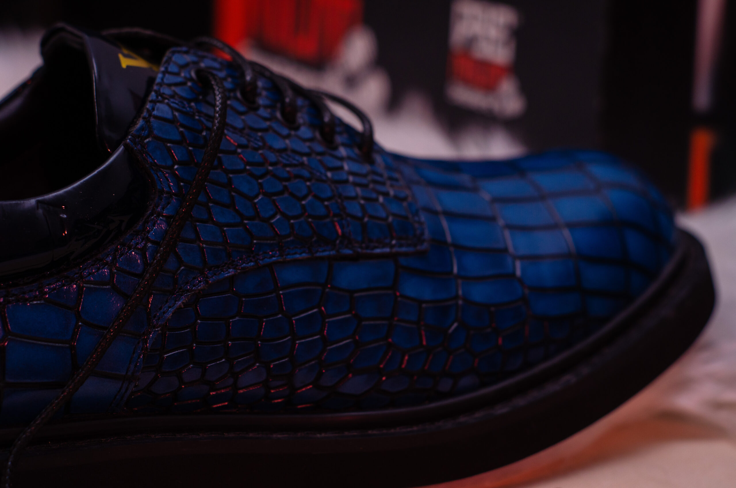 Distinctive Alligator-Embossed Leather: The upper features a unique, deep blue-and-black metallic sheen with an exotic alligator-skin pattern, ensuring a striking and unforgettable look.