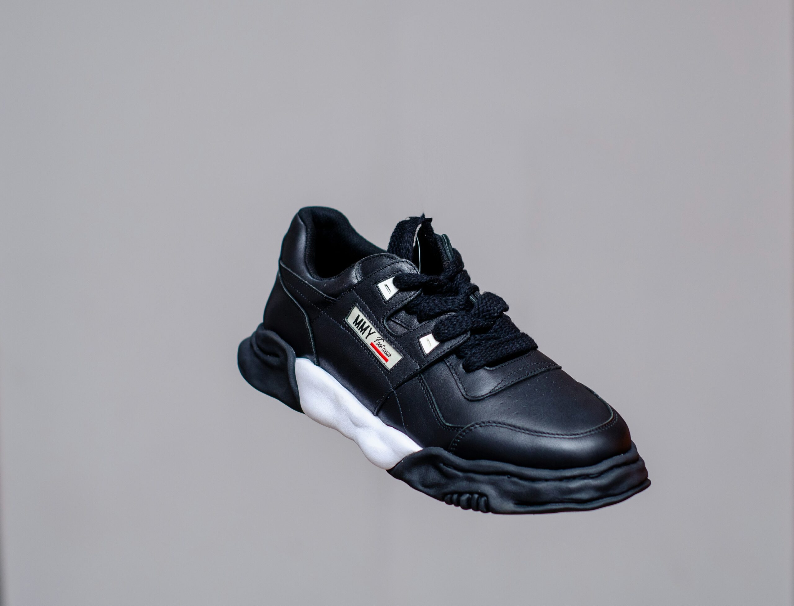 These sleek and stylish sneakers feature a black leather upper, contrasting white laces, and a distinctive chunky sole. The “MMY” logo adds a touch of luxury and sophistication.
