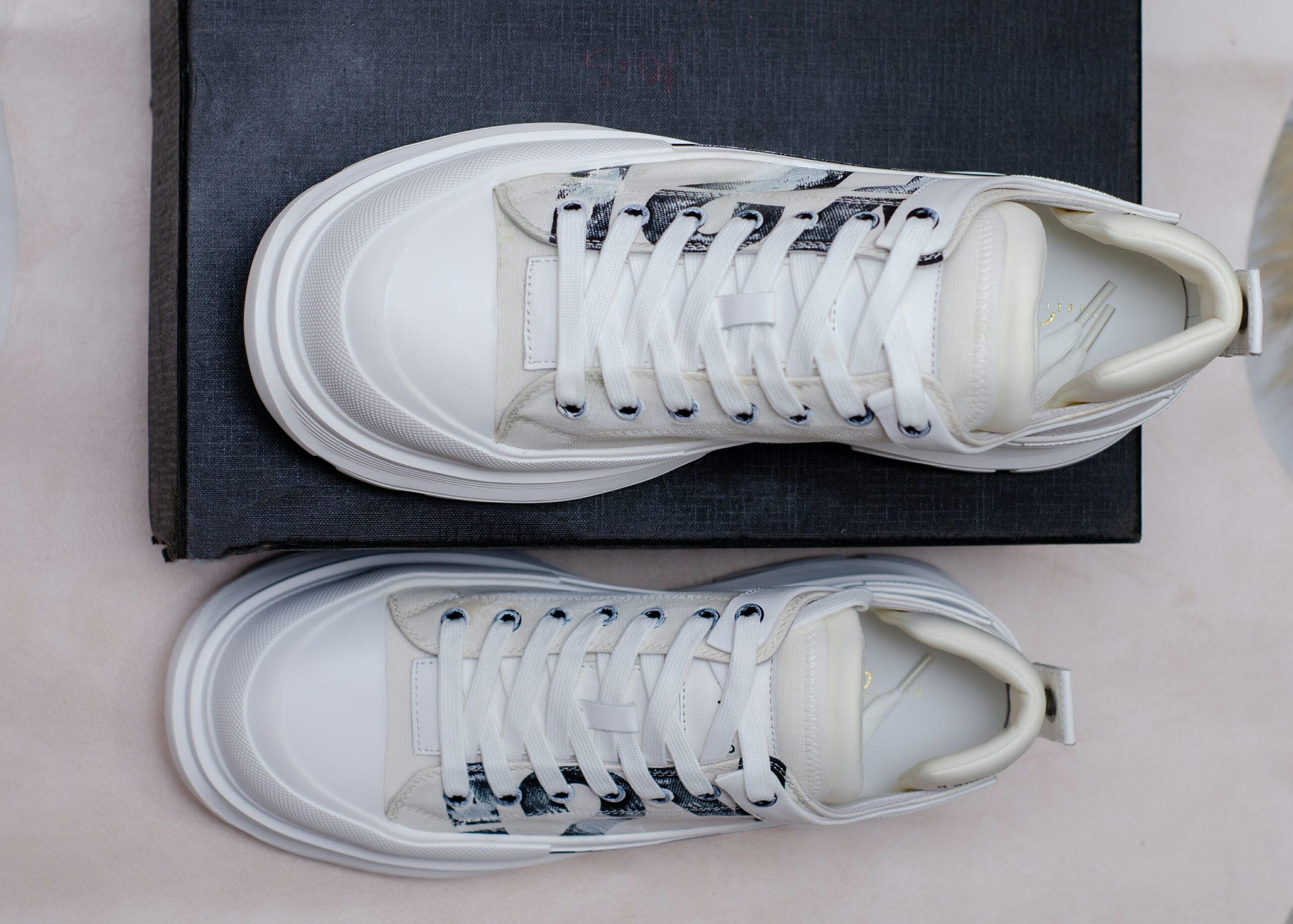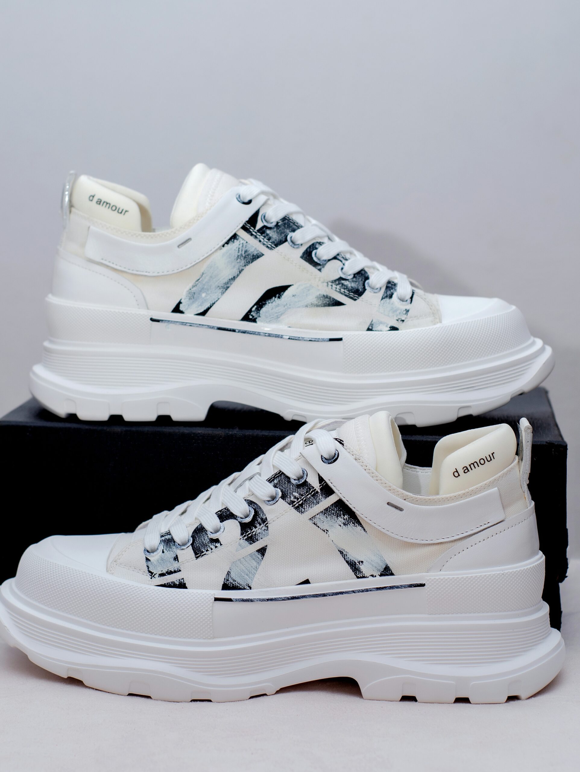 These eye-catching sneakers feature a clean white canvas upper adorned with a striking abstract print. The chunky sole and platform design elevate your look, while the “D’Amour” branding adds a touch of sophistication.